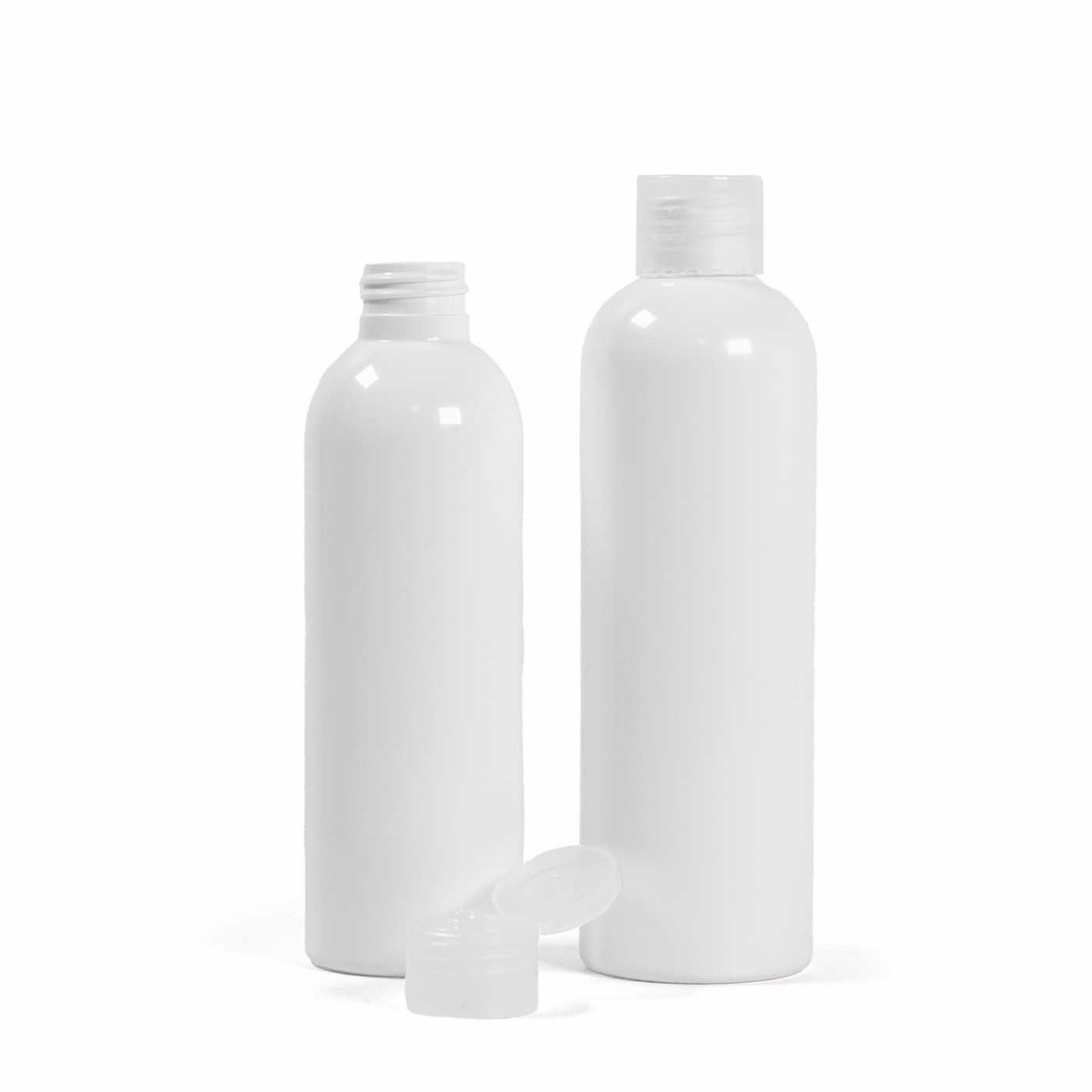 Bílá plastová láhev, průhledné flip‑top víčko, 250 ml