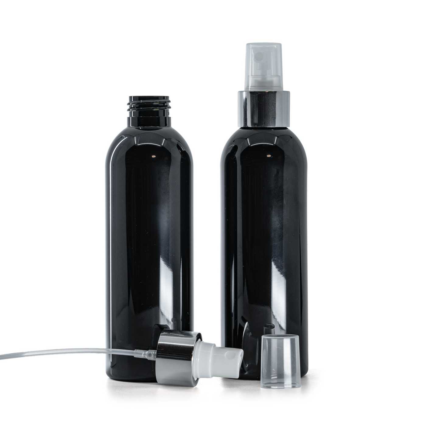 Černá lesklá plastová láhev, bílý rozprašovač s lesklým stříbrným kroužkem, 200 ml