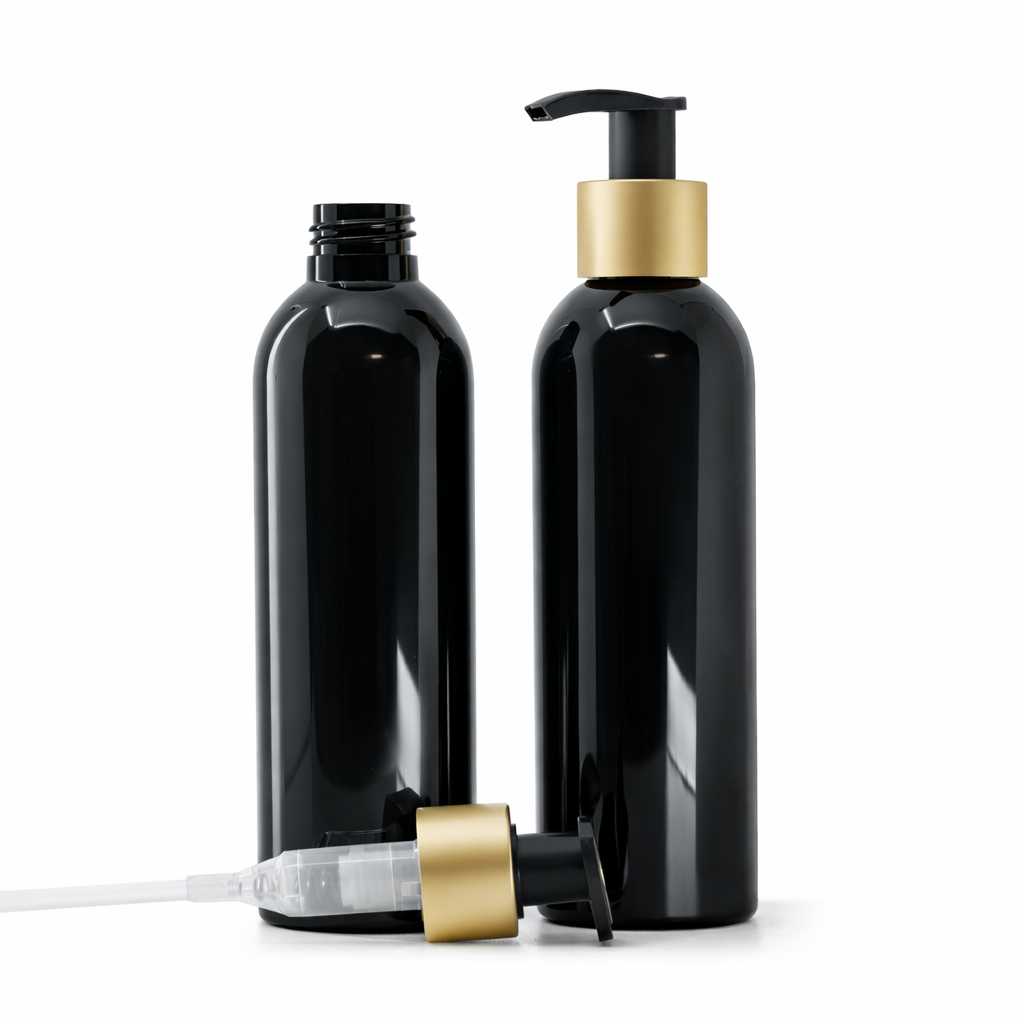 Plastová lahev s černým lesklým povrchem a matným černo-zlatým dávkovačem je elegantní a praktický obal určený zejména pro kvalitní kosmetiku a tekuté přípravky, kde je důležitá přesná a pohodlná aplikace. Díky kombinaci odolného plastového materiálu a spolehlivého dávkovacího systému poskytuje bezpečné balení pro různé tekuté formulace, které vyžadují hygienické, kontrolované a esteticky působivé dávkování.