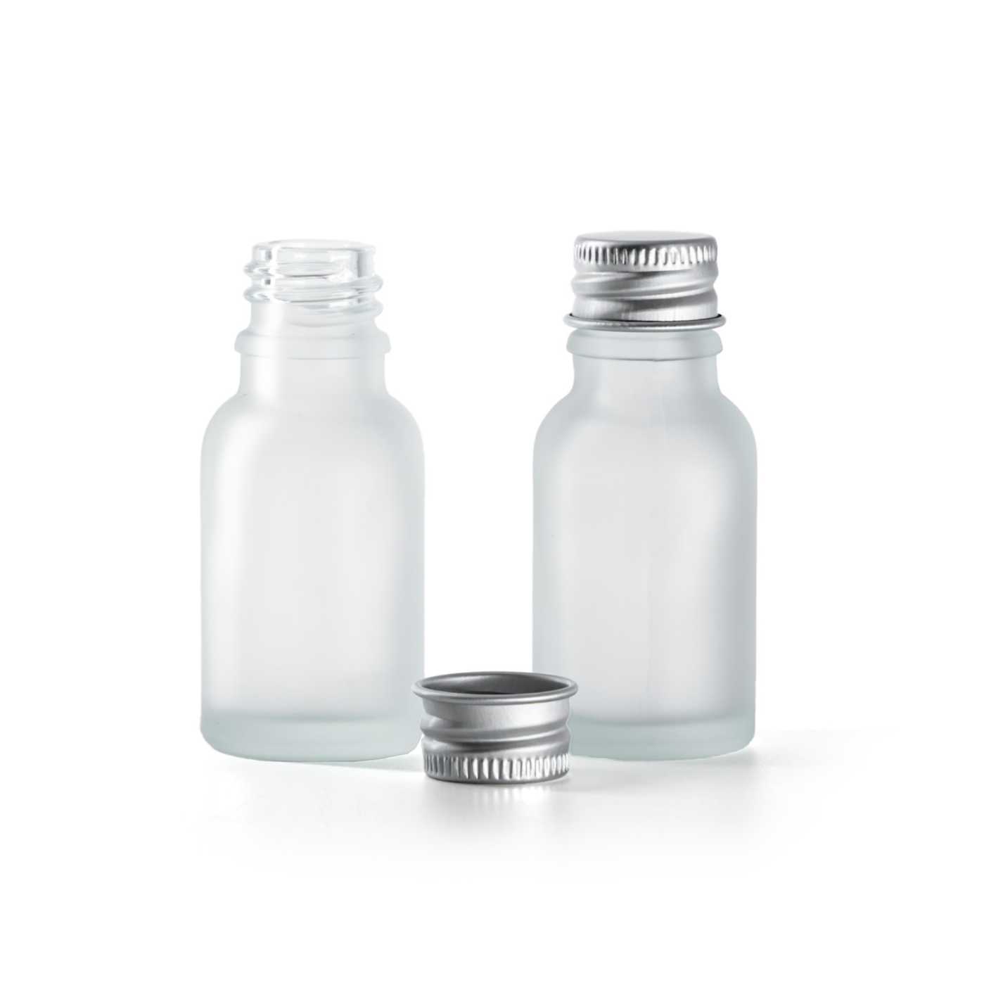 Matná čirá skleněná lahvička s hliníkovým uzávěrem, 15 ml