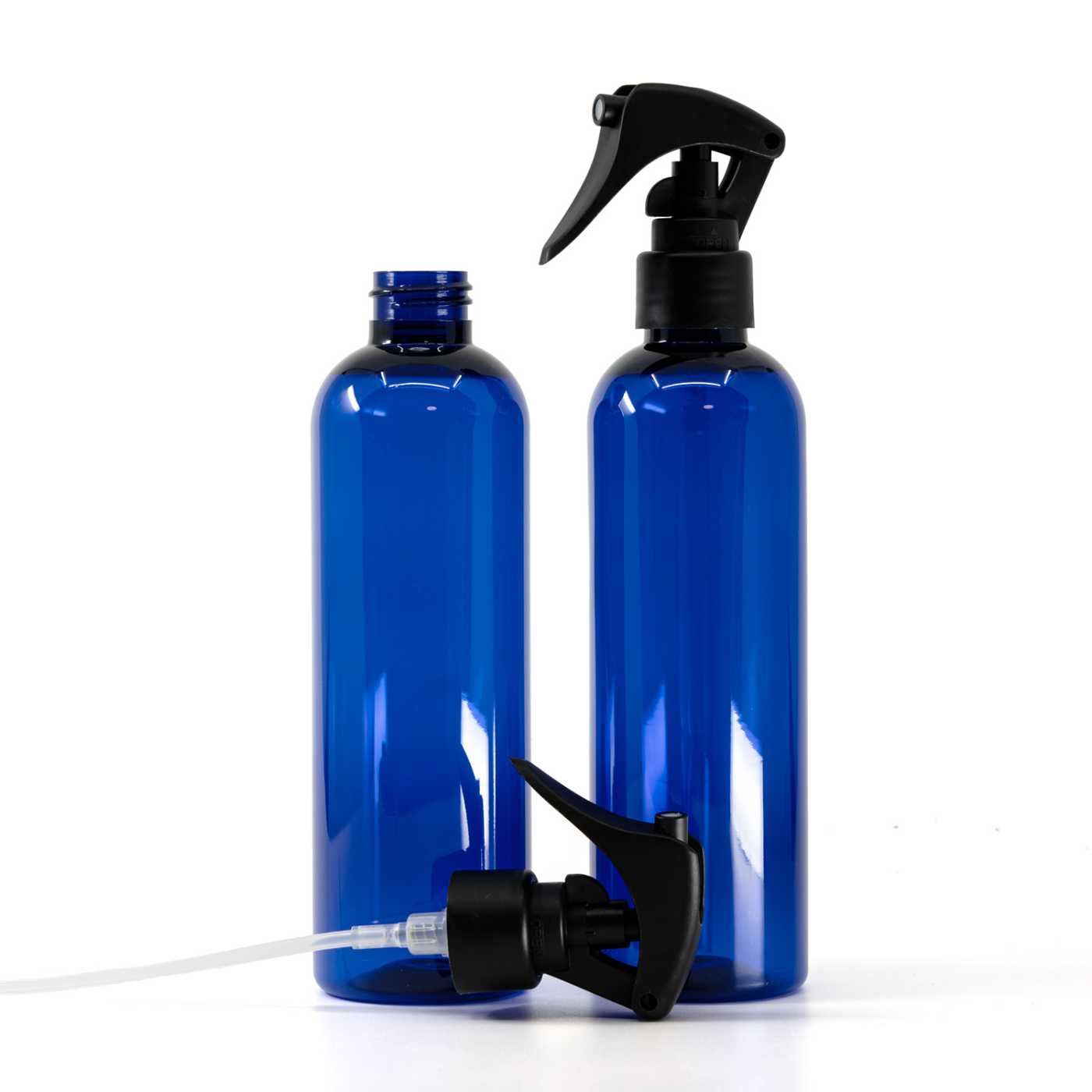Plastová láhev, modrá, matný černý pákový rozprašovač, hladká obruč, 250 ml