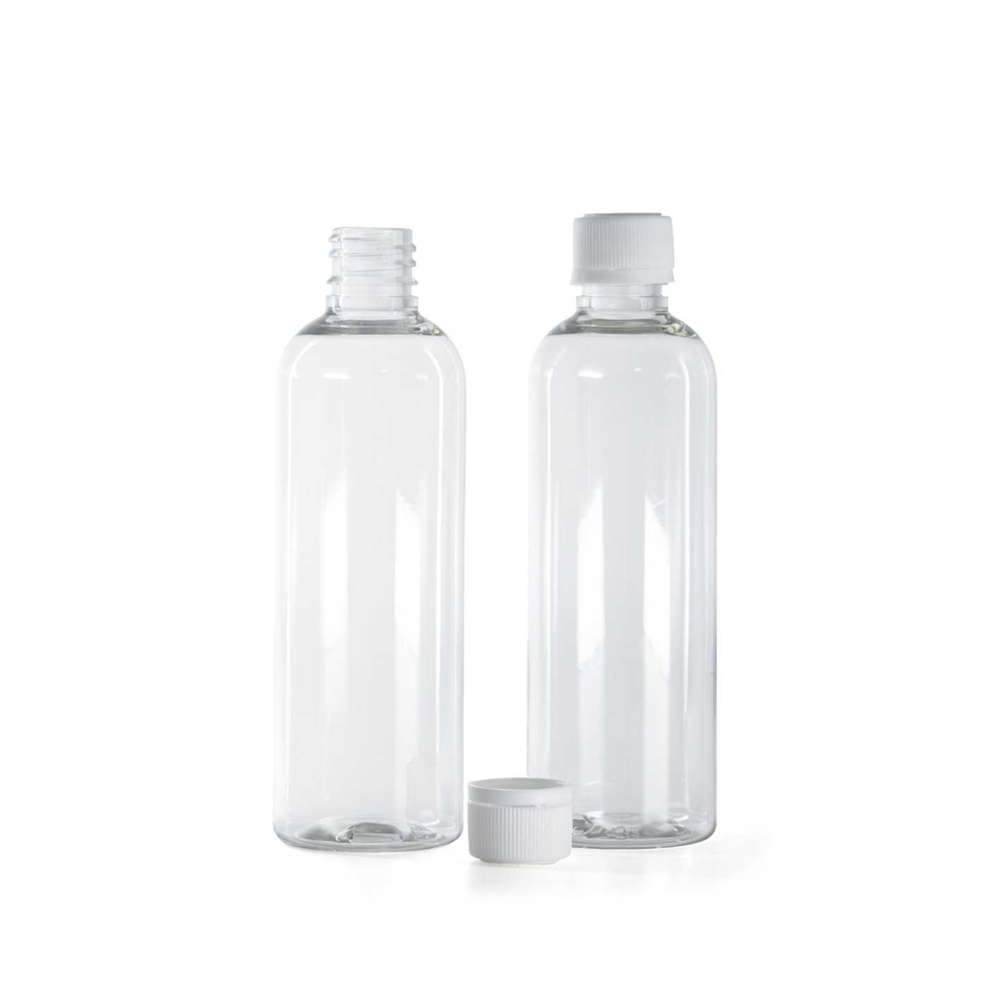 Plastová láhev průhledná, bílé víčko s bezpečnostní poistkou, 100 ml