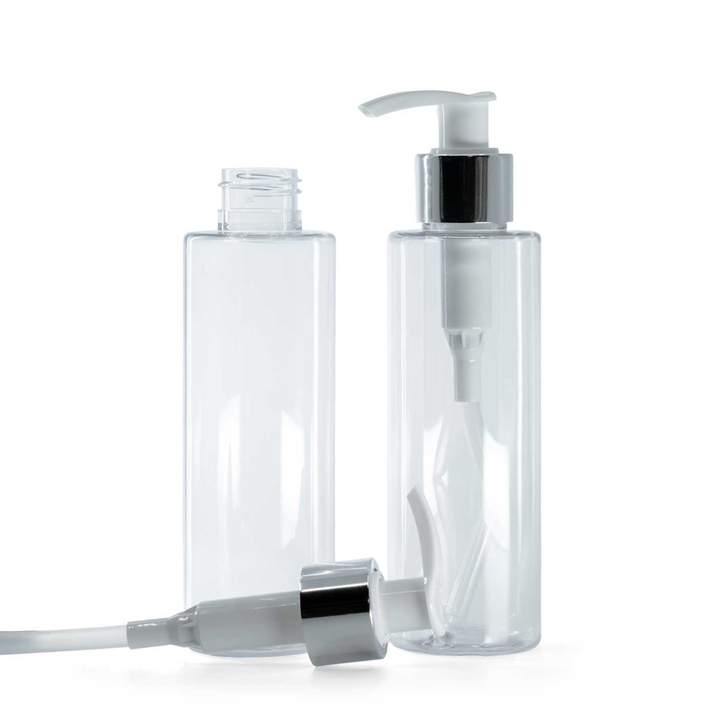 Plastová láhev průhledná, bílo-stříbrný dávkovač, 150 ml