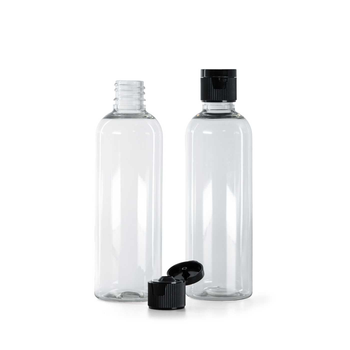 Průhledná plastová láhev z PET s lesklým povrchem.