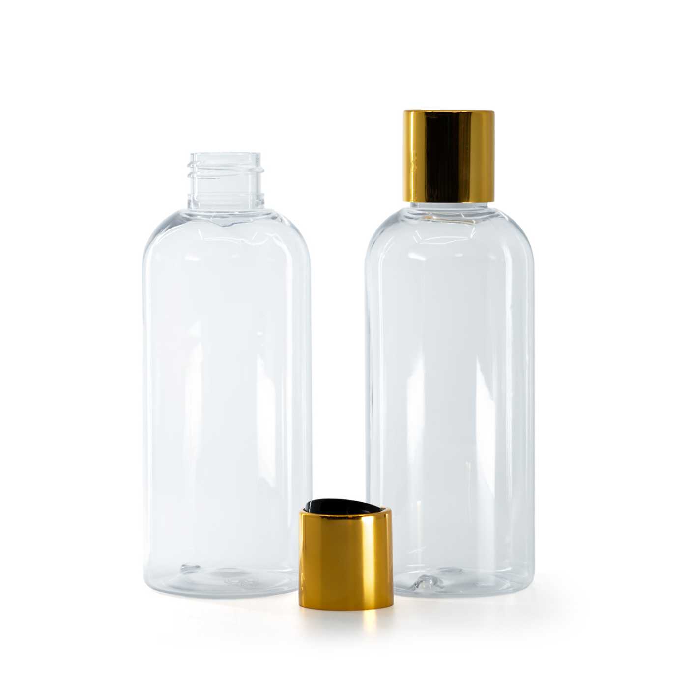Plastová láhev průhledná, zaoblená, disc top uzávěr, zlatý, černý vrch, 200 ml