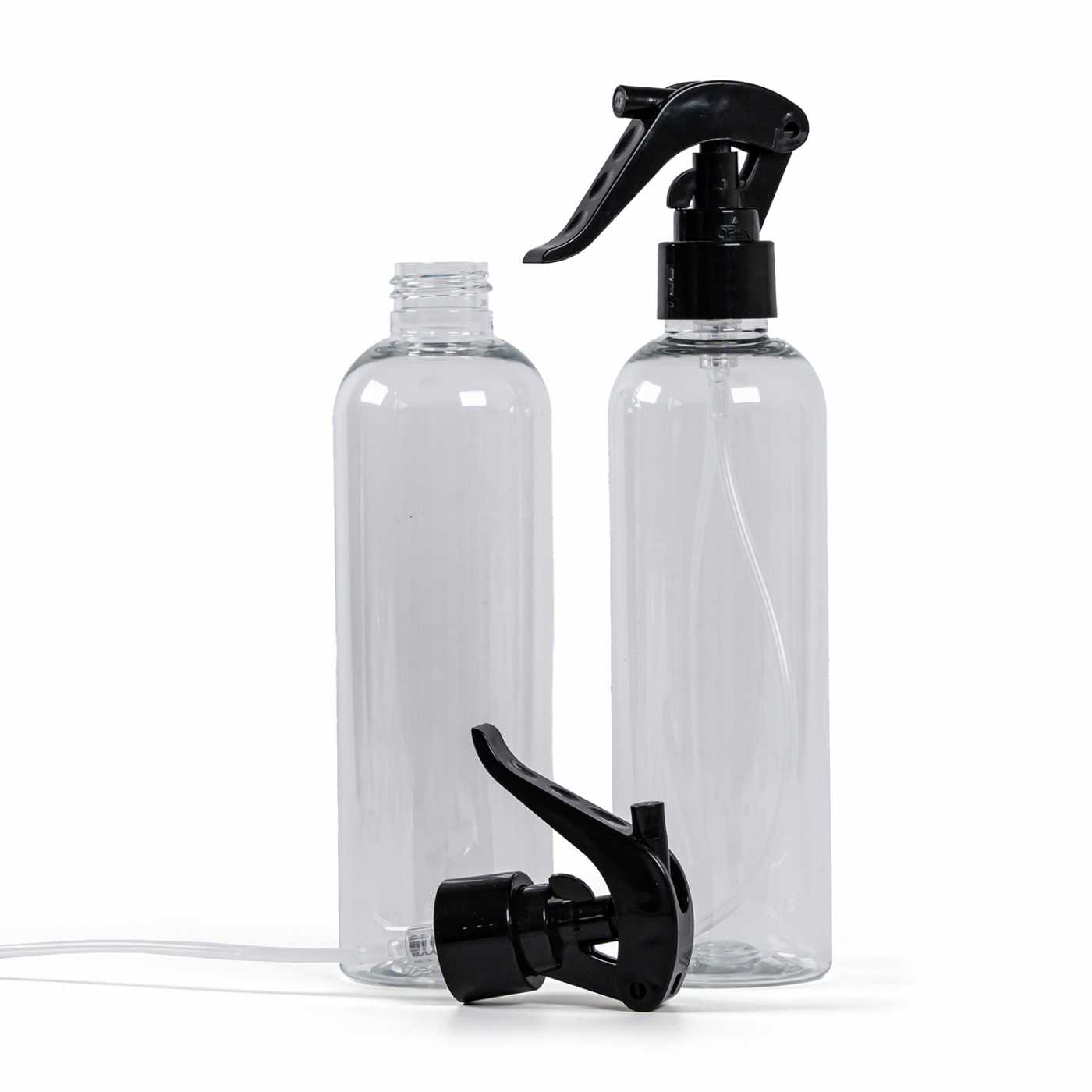 Plastová láhev, transparentní, černý trigger rozprašovač, 250 ml