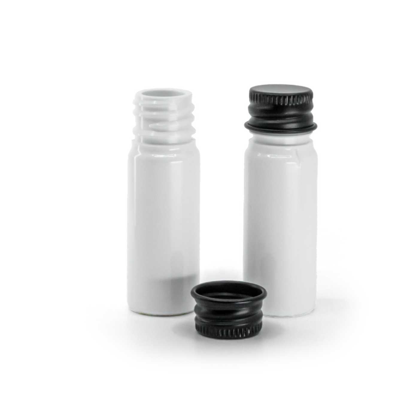 Plastová lahvička, lékovka, bílá, černý hliníkový uzávěr, 10 ml