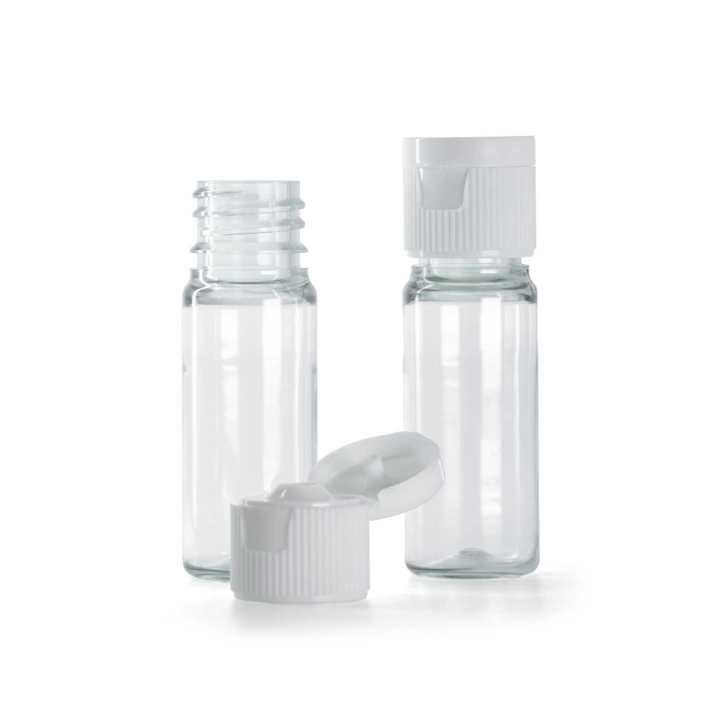 Plastová lahvička, lékovka, průhledná, plastový uzávěr, odklápěcí, flip top 18 mm, bílý, 10 ml
