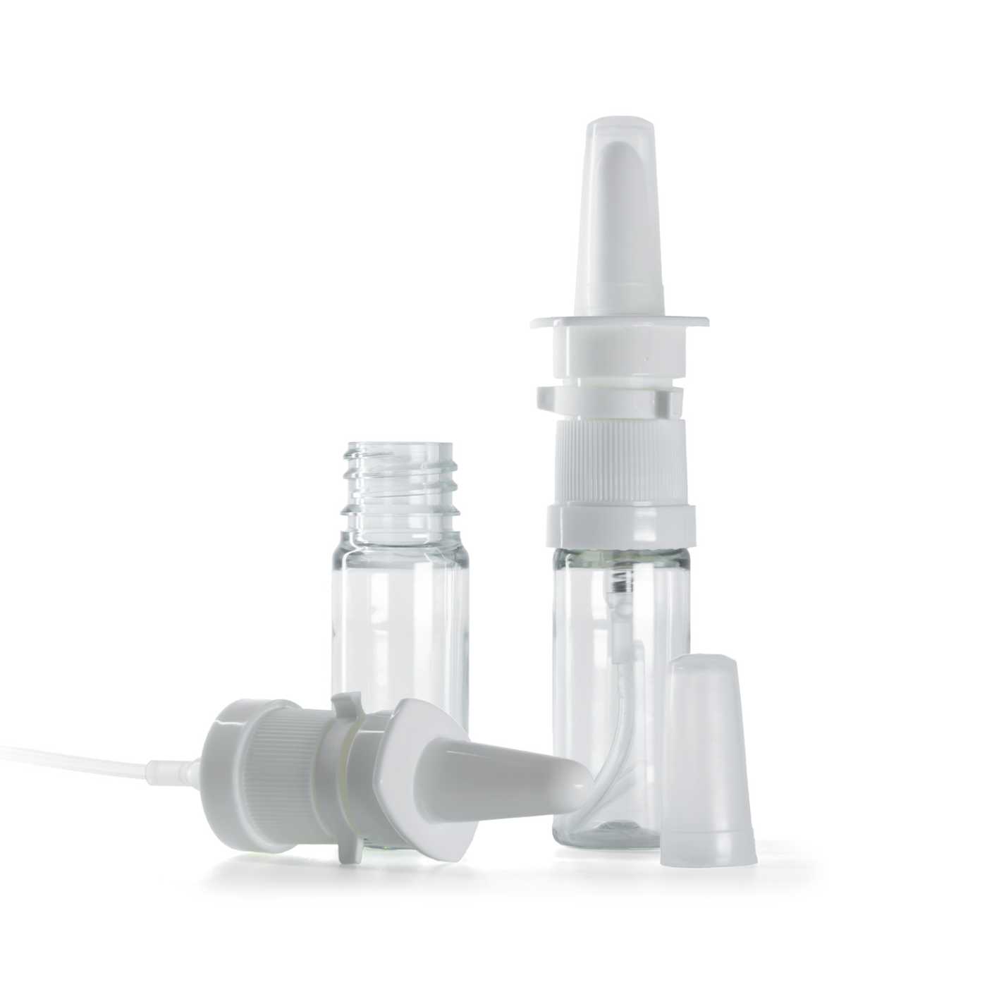 Bílýplastový aplikátor nosní tekutiny. Nosní sprej je vhodný pro kombinaci se všemi skleněnými lahvičkami s hrdlem 18 mm.