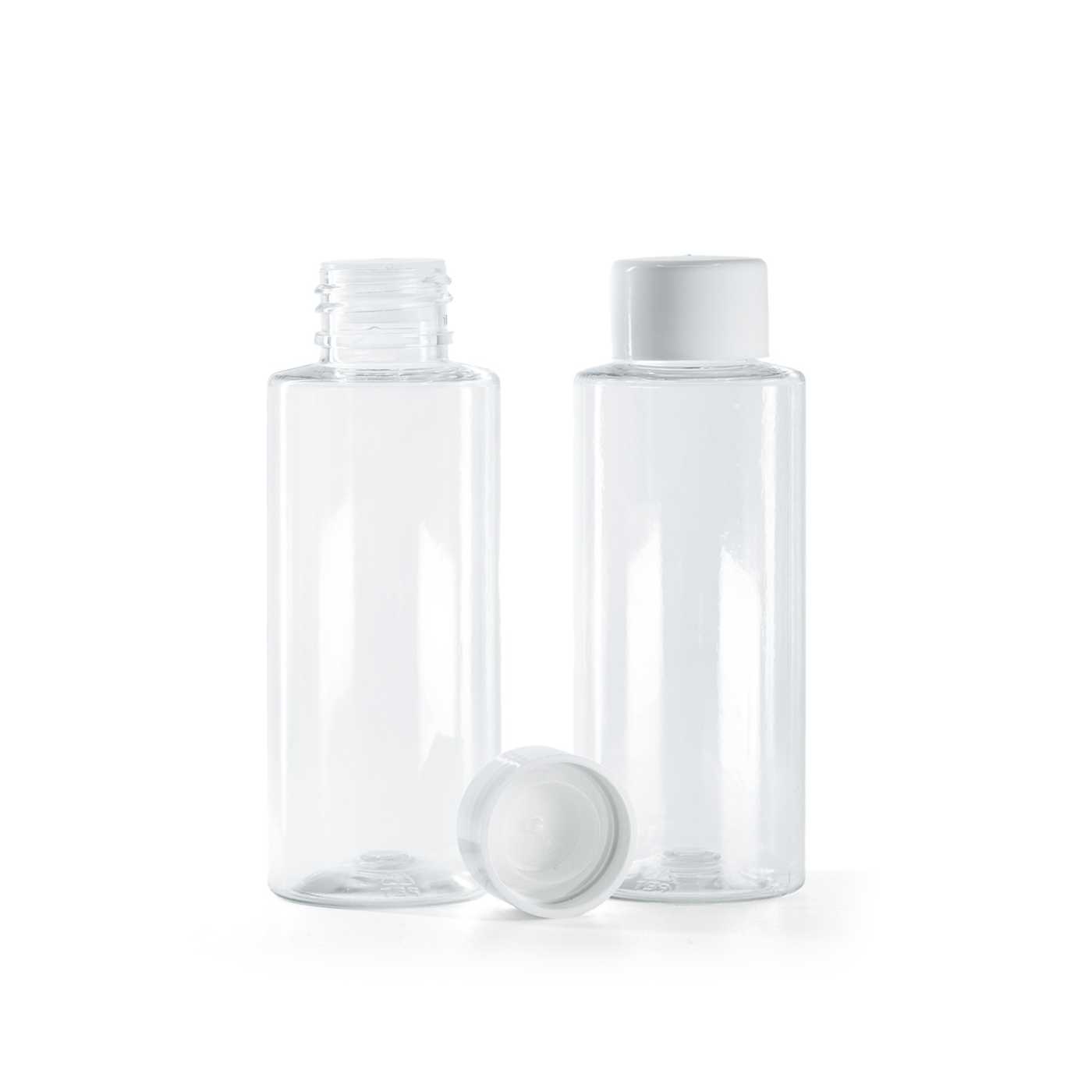 Plastová průhledná láhev, hladké bílé víčko s redukcí, 100 ml
