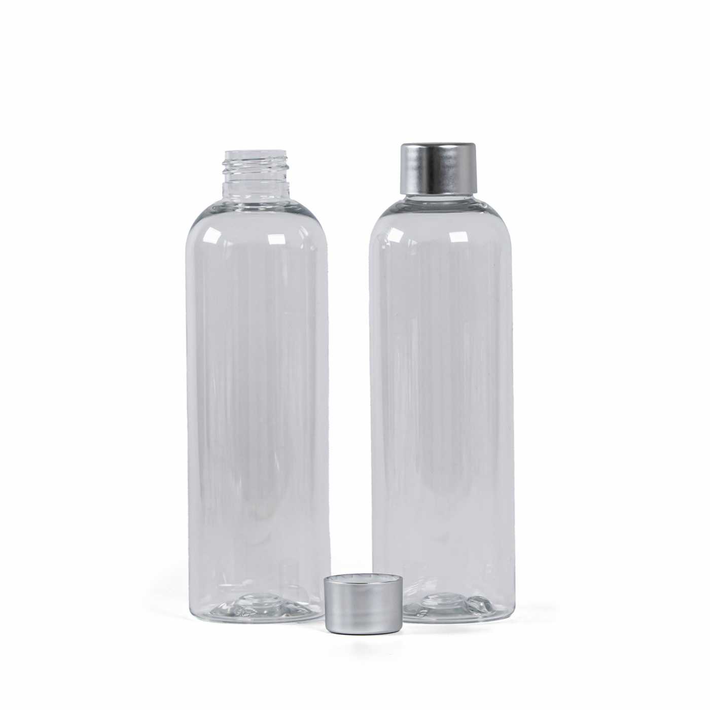Průhledná plastová láhev, 24/410, matně stříbrné plastové víčko, 250 ml