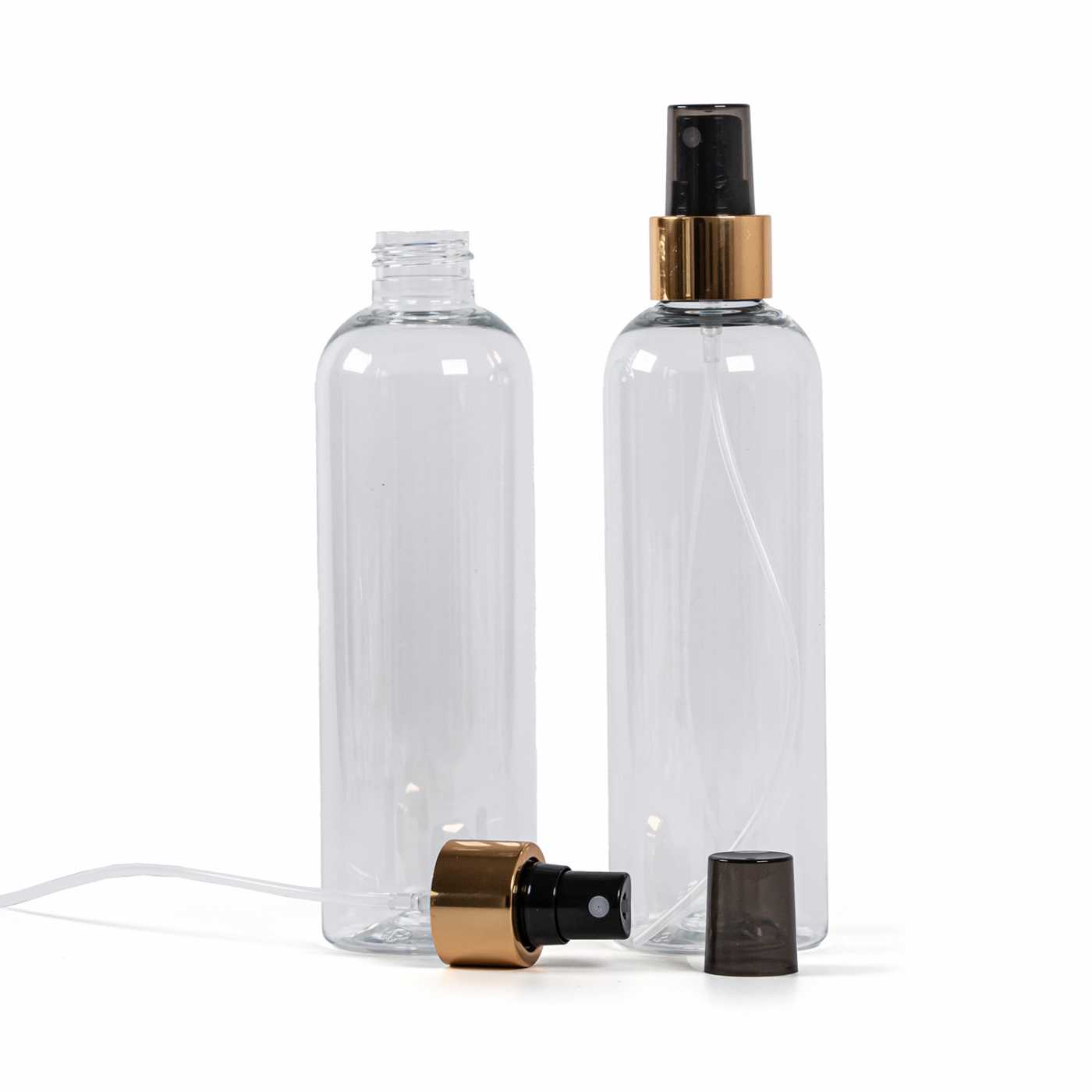 Průhledná plastová láhev, černý rozprašovač s lesklým zlatým kroužkem, 250 ml