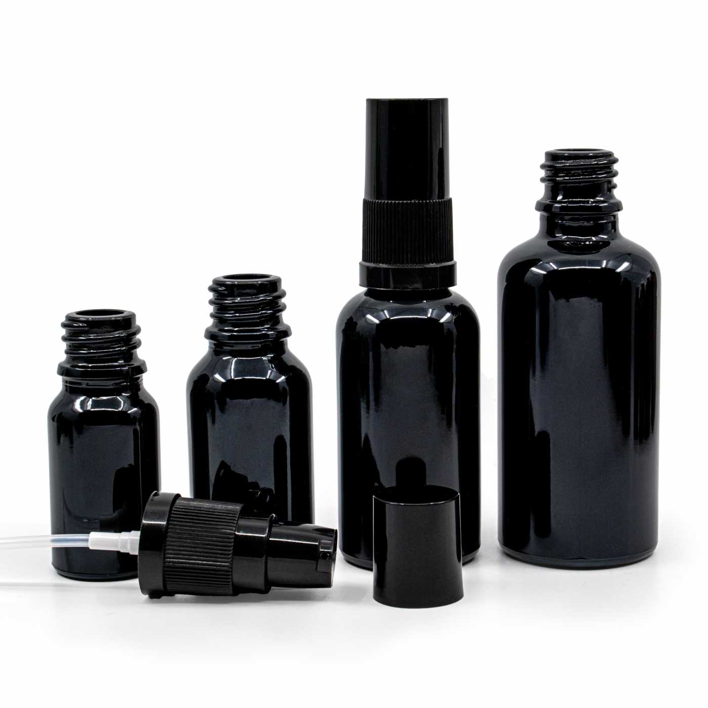 Černý plastový dávkovač krému s černým neprůhledným uzávěrem. Je vhodný pro všechny naše skleněné lahvičky.
