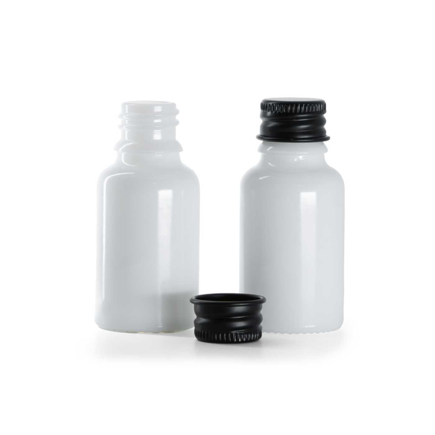 Skleněná láhev, lékovka, bílá, černý hliníkový uzávěr, 15 ml