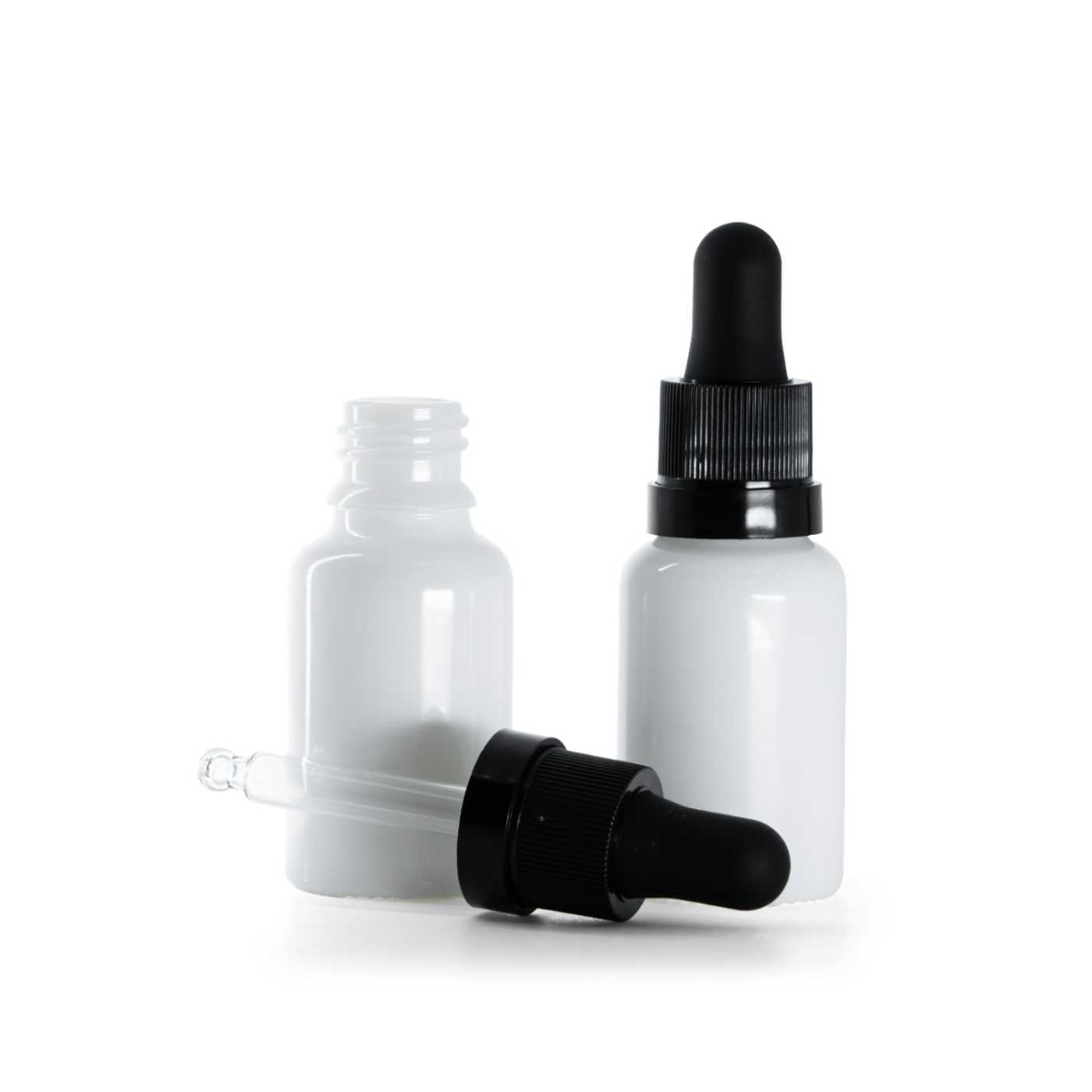 Bílá skleněná lahvička, tzv. lahvička, je vyrobena ze silného skla. Používá se k uchovávání tekutin.Objem: 15 ml