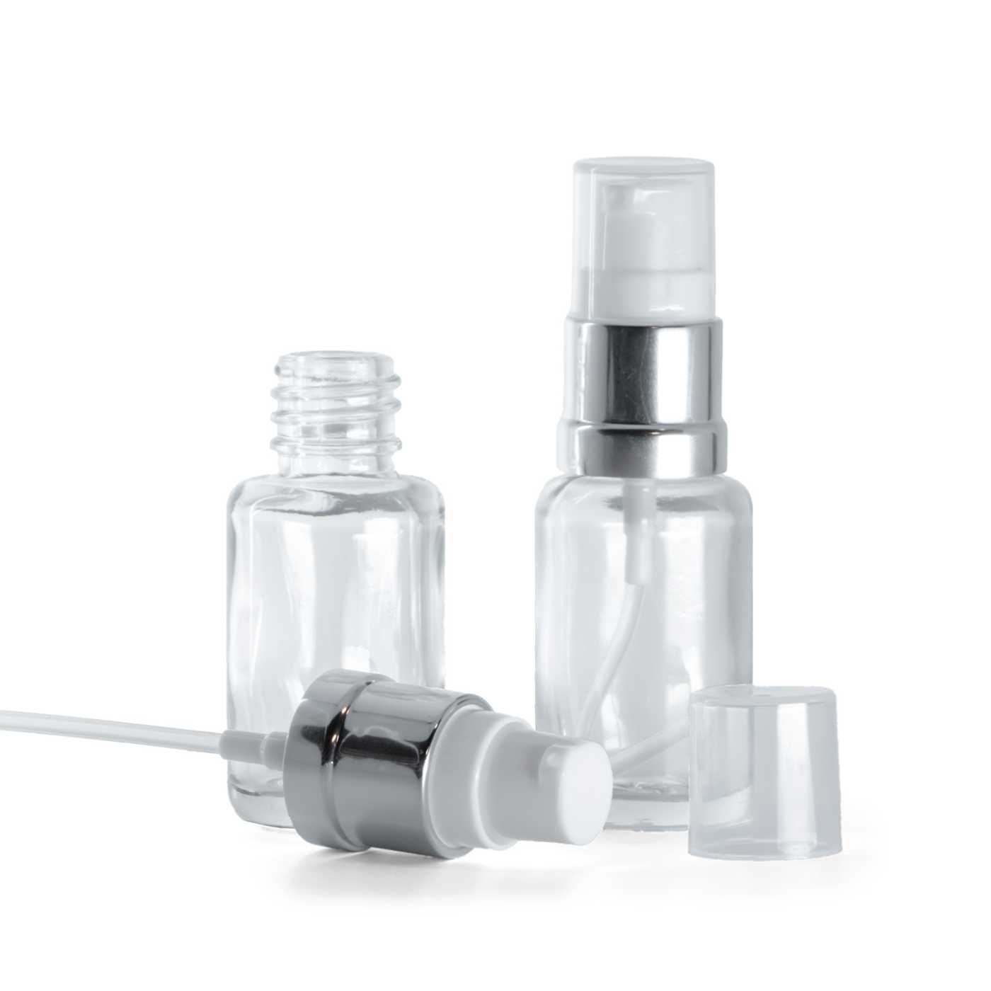 Skleněná lahvička, lékovka, bílo-stříbrný lesklý dávkovač, 12 ml